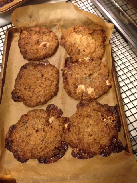 Once the dough was all mixed up, I portioned it out and refrigerated it for an hour. Then I heated the oven to 375°F and baked two sheet pans with six cookies apiece for 18 minutes. When the oven timer went off, I learned a two things: 1) our oven runs hot, and 2) the bottom rack in the oven gets a whole lot hotter than the top rack. The cookies baking on the bottom rack totally burned: