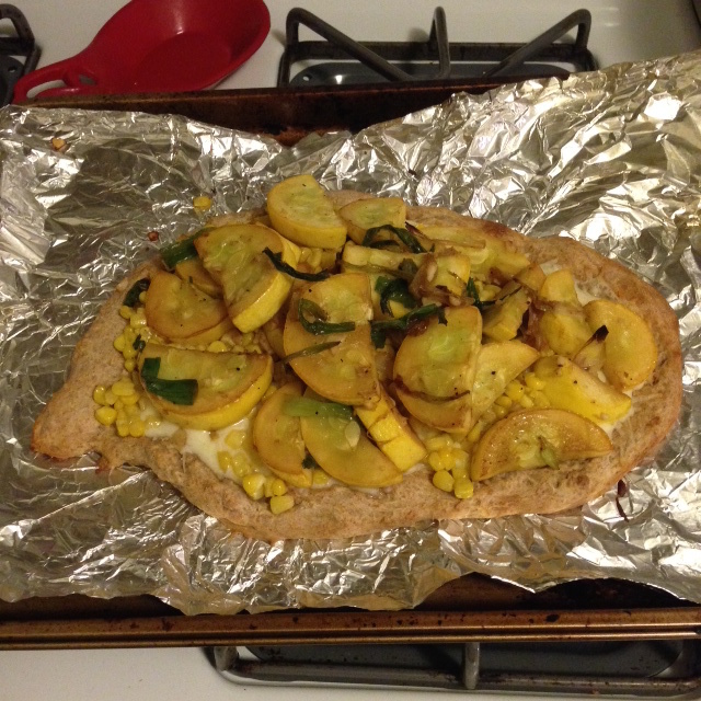 Charred Scallion and Corn Flatbread with Summer Squash and Salsa Fresca