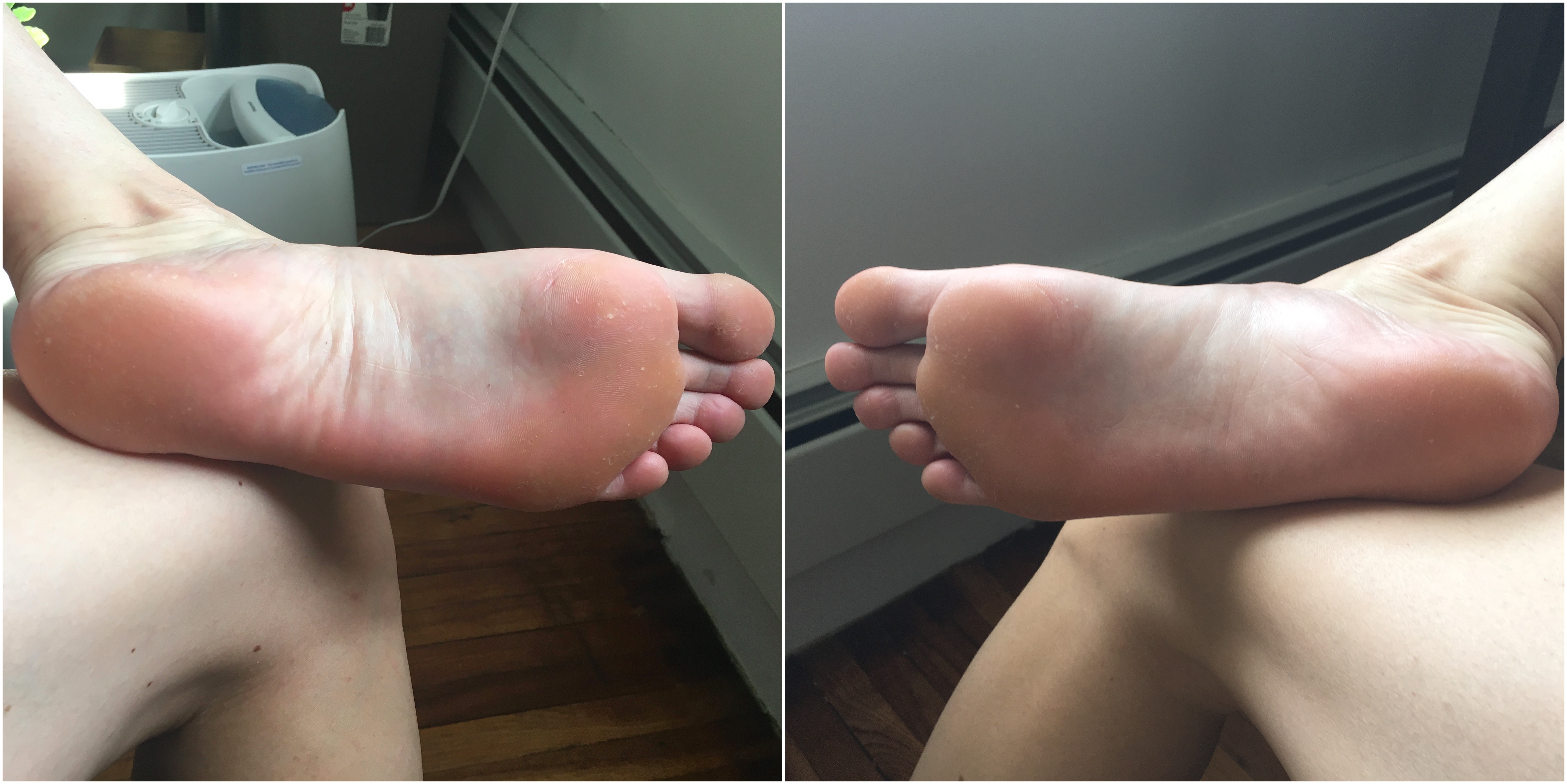 I completely forgot to take true “before” pictures of the soles of my feet, but I took pics of them after having soaked my feet in the liquid. The peeling process doesn’t start immediately, so these photos are pretty much how my feet looked before soaking anyway: